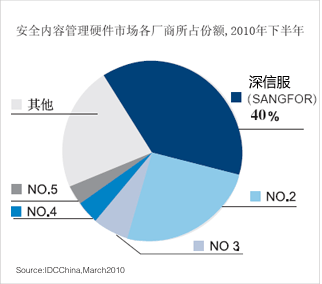 深信服科技在IDC中国发布的2010年下半年中国安全内容管理市场(上网行为管理市场)报告中占有率达到40%,在2009年占有率达到33.8%,蝉联市场占有率第一。
